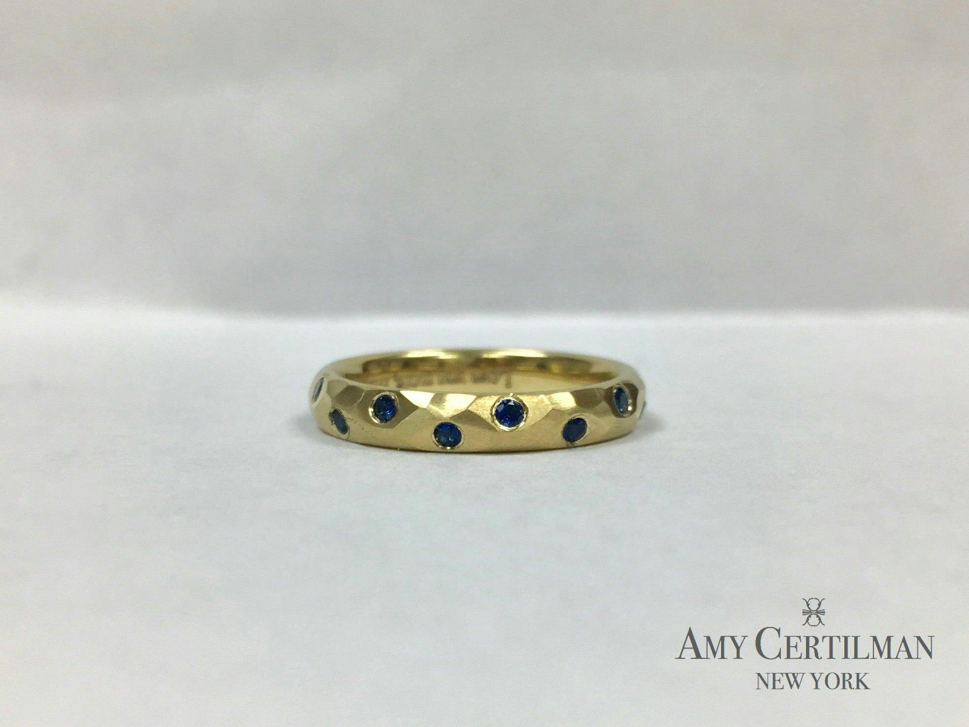Perfectly set sapphires in hand hammered finished band. 4mm 18K Yellow Gold Band Shown.