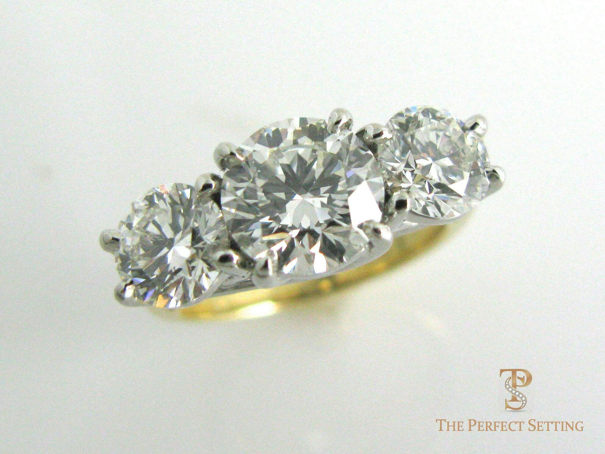Three Stone Diamond Ring set in Platinum with 18K yellow gold band. Featured ring shown with GIA Certified Excellent Cut Round Diamonds. Custom Trellis Setting. Similar custom ring shown with a round center and pear sides and lower "shoulders"