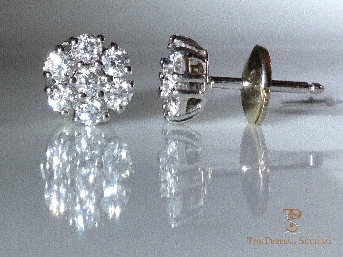 The featured pair showcases 1ctw total weight of FG/VS diamonds set in 14K gold with secure safety post and back closures. Each diamond is hand-selected for exceptional brilliance and quality, creating a sparkling floral design that catches the light beautifully.