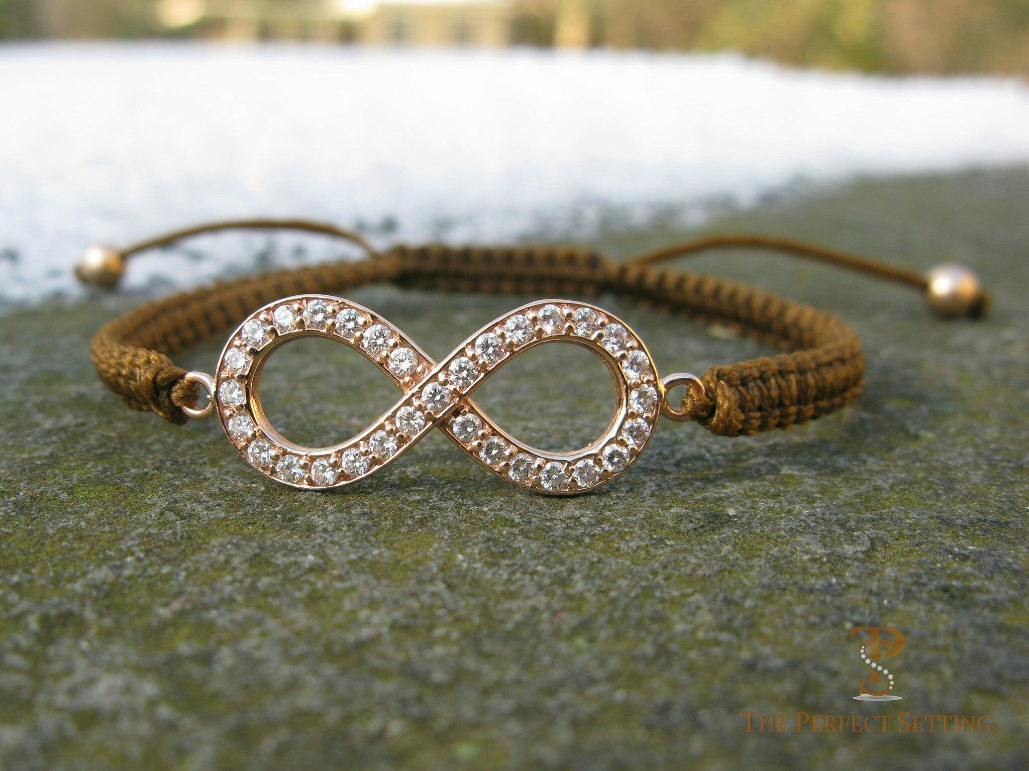 Deb B B My husband bought this for me as a gift and I never take it off! The diamonds are cut stones, not pave, and really have a fiery sparkle. It's so comfortable I don't even feel like I'm wearing a bracelet. Great size of infinity and macrame work is refined.\nI've received lots of compliments on this bracelet even though I wear it with several others. Thanks for giving my husband the heads up on this piece!