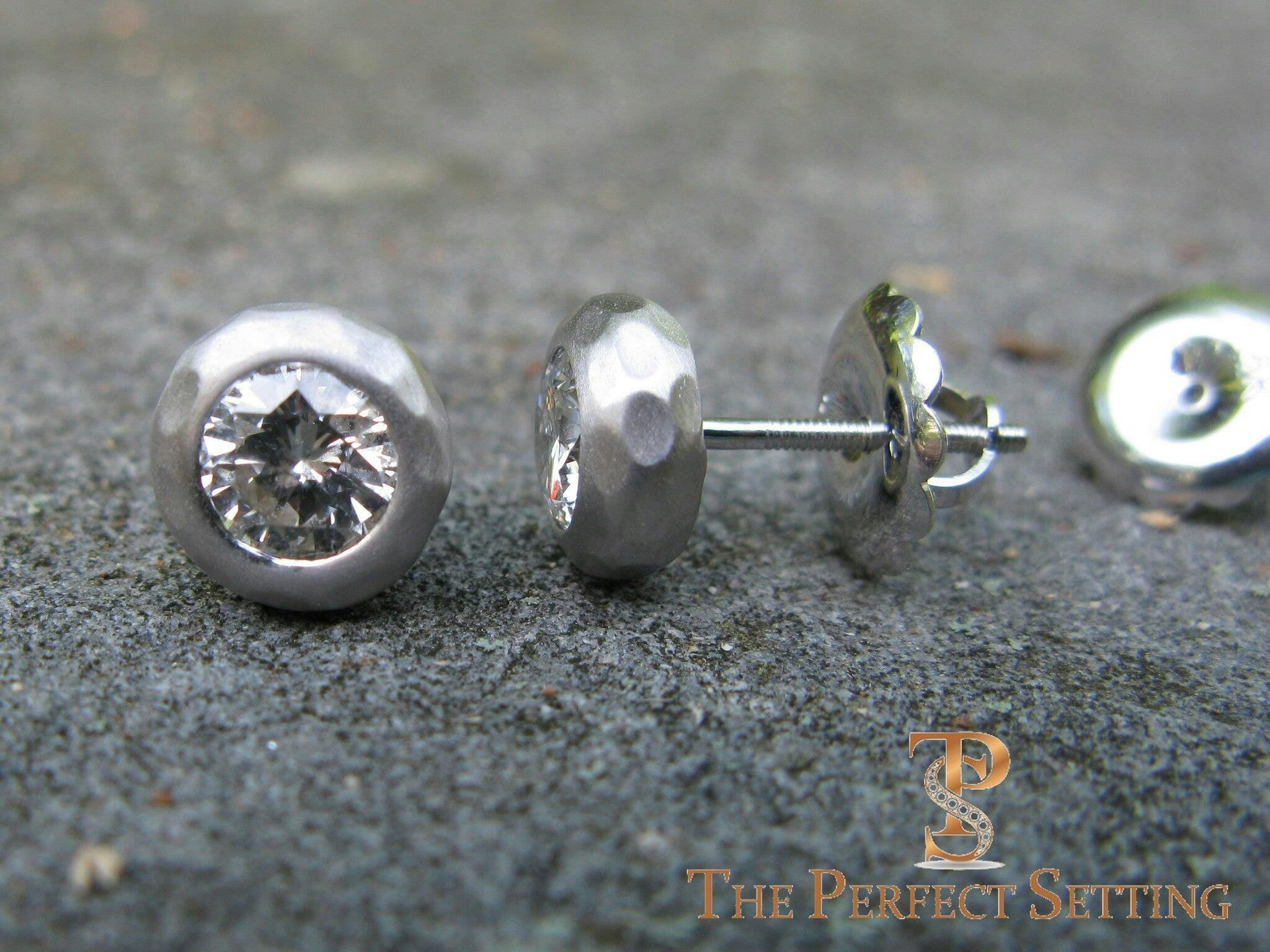 Rustic Diamond Studs Hammered Bezel Setting White Gold